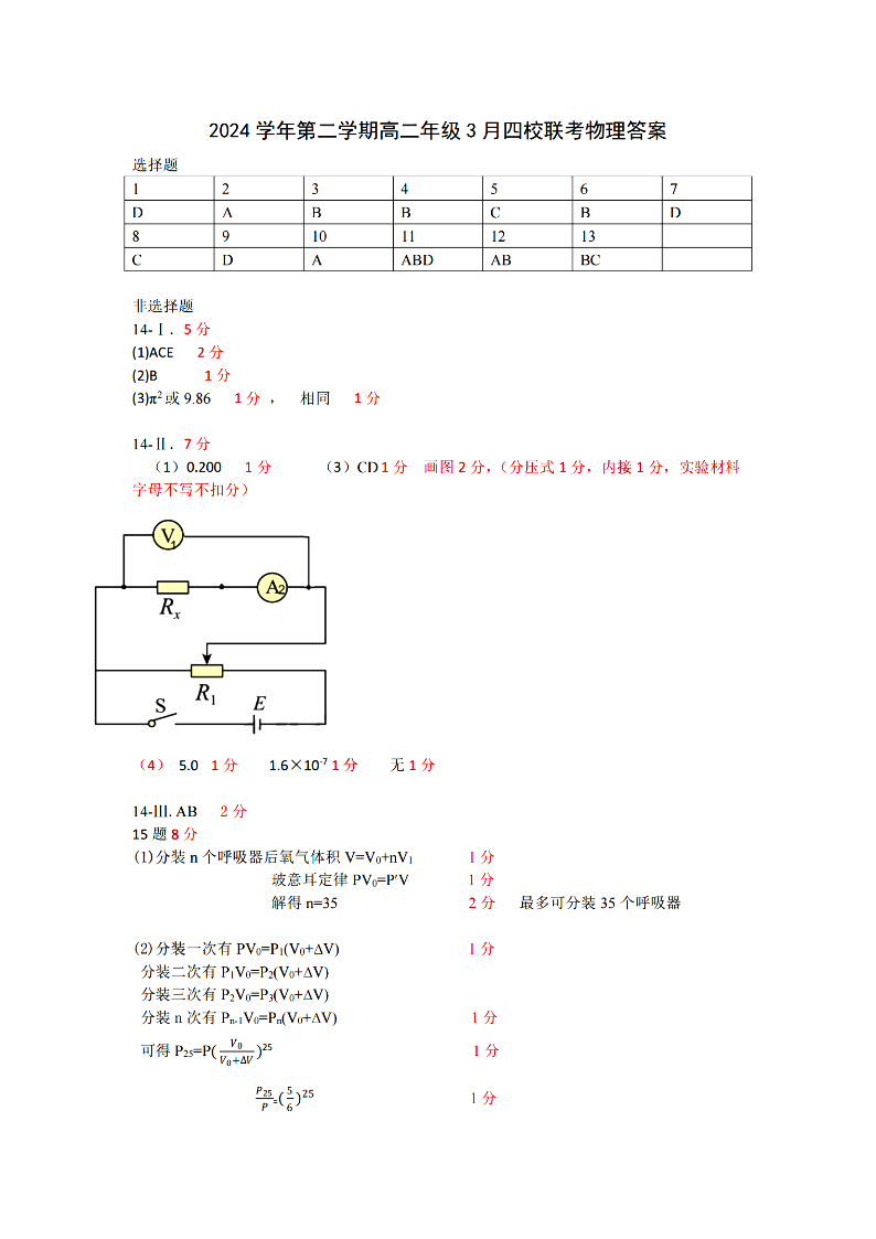 浙江四校联盟2024学年高二第二学期3月联考 物理答案.pdf