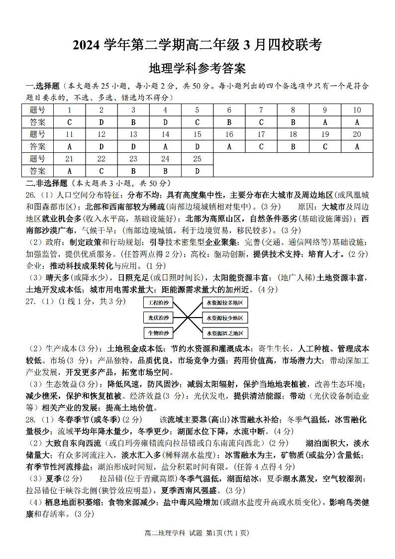 浙江四校联盟2024学年高二第二学期3月联考 地理答案.pdf