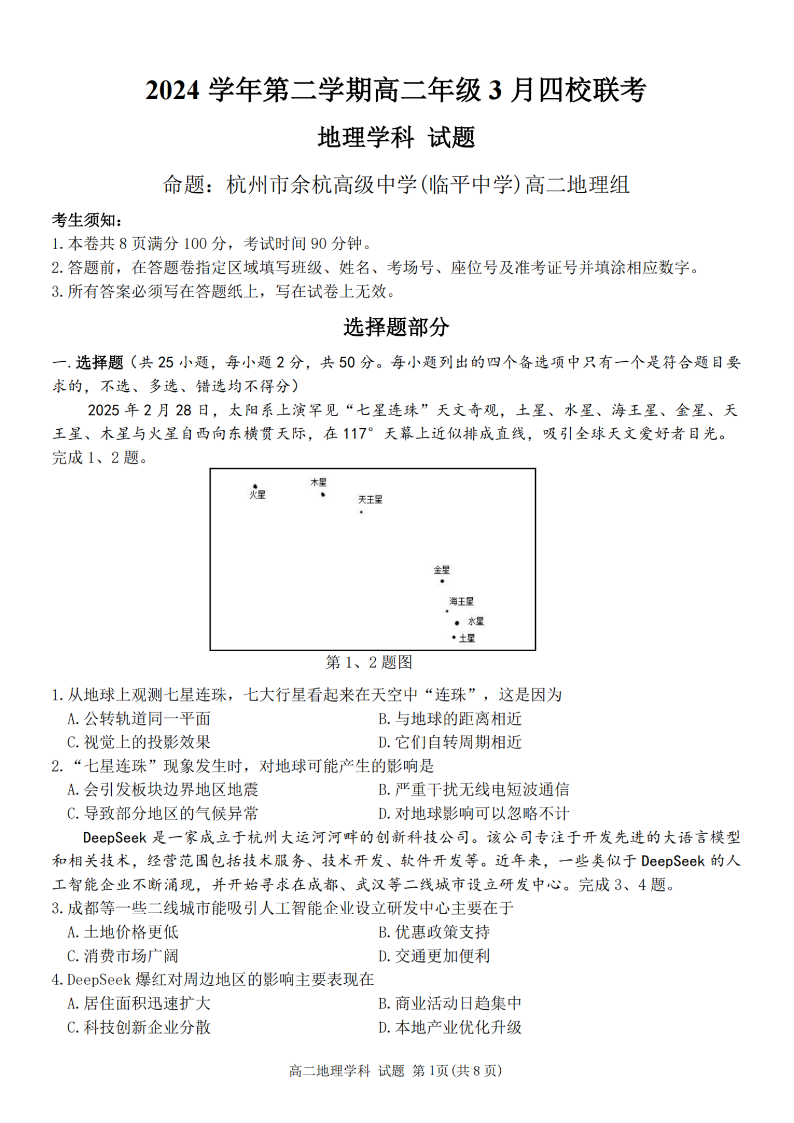 浙江四校联盟2024学年高二第二学期3月联考 地理.pdf