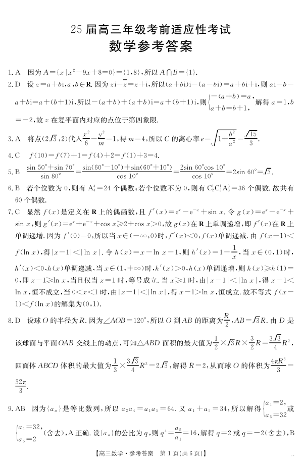安徽省六安市市区2025届高三年级考前适应性考试 数学答案.pdf