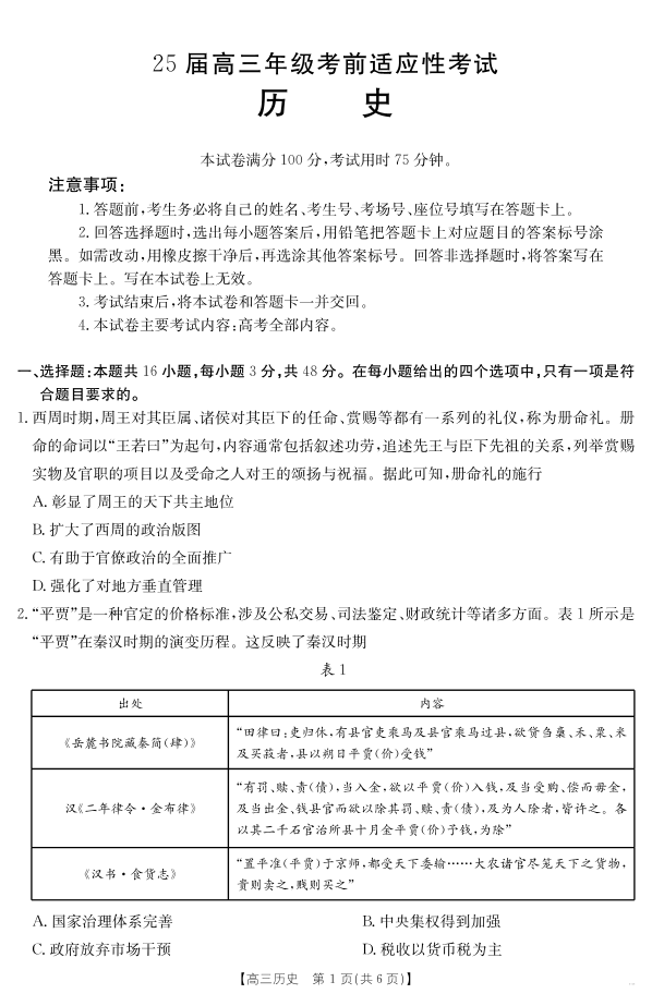安徽省六安市市区2025届高三年级考前适应性考试 历史.pdf