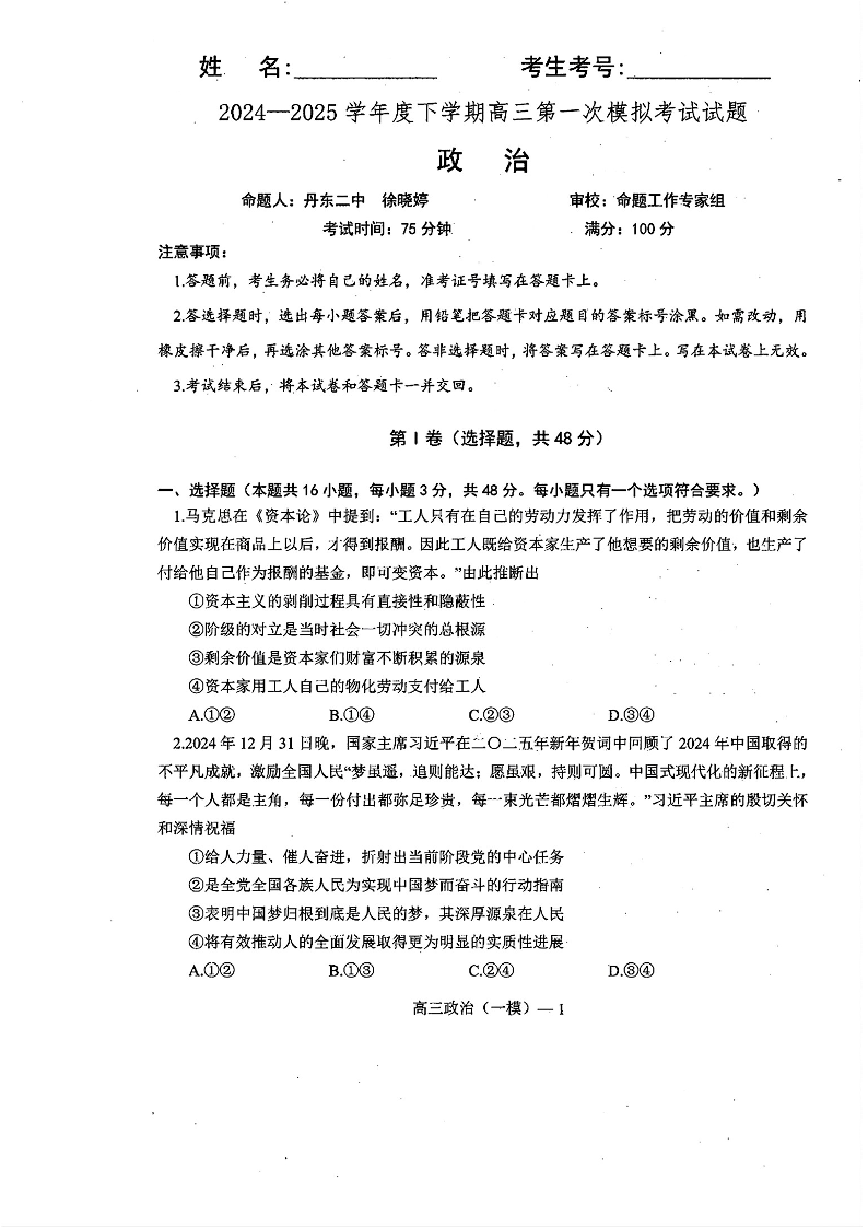 辽宁省协作校2025届高三下学期第一次模拟考试 政治.pdf