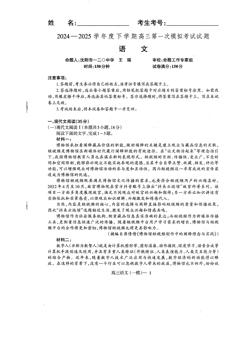 辽宁省协作校2025届高三下学期第一次模拟考试 语文.pdf