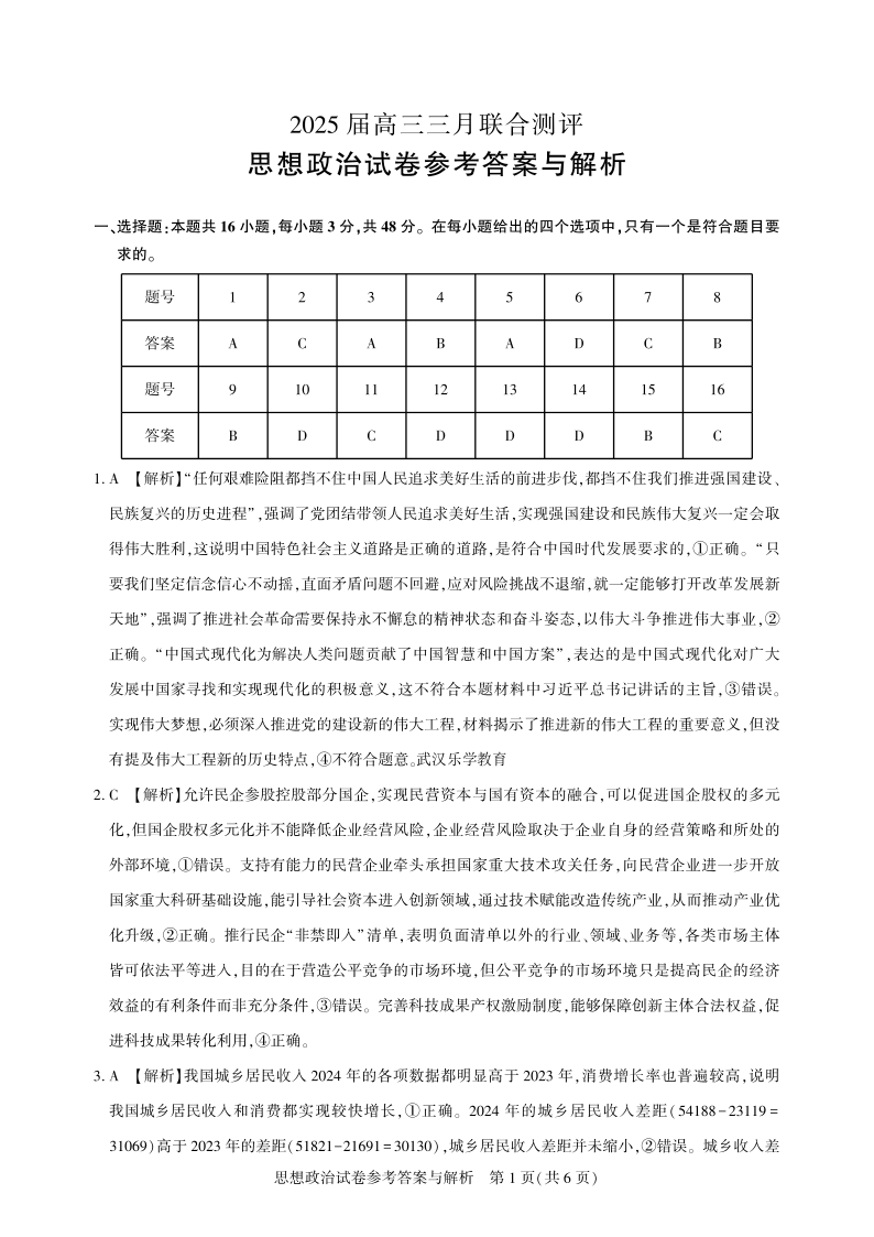 湖北省高中名校联盟2025届高三三月联合测评 政治答案.pdf