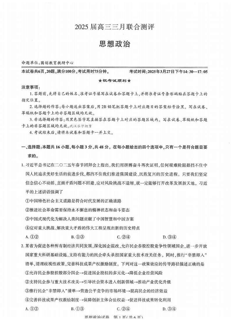 湖北省高中名校联盟2025届高三三月联合测评 政治.pdf