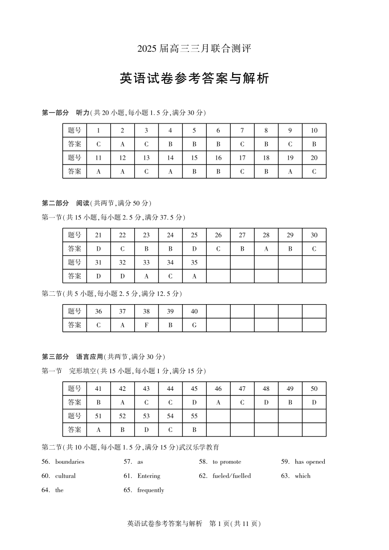 湖北省高中名校联盟2025届高三三月联合测评 英语答案.pdf
