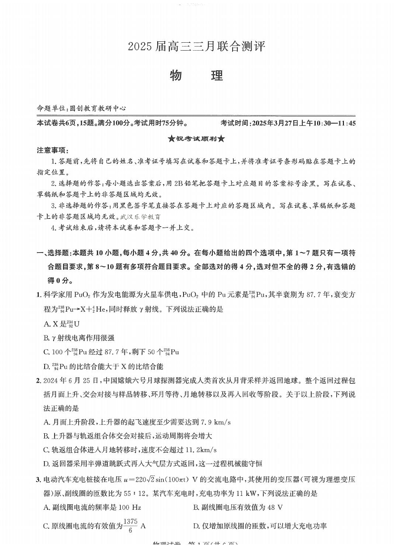 湖北省高中名校联盟2025届高三三月联合测评 物理.pdf