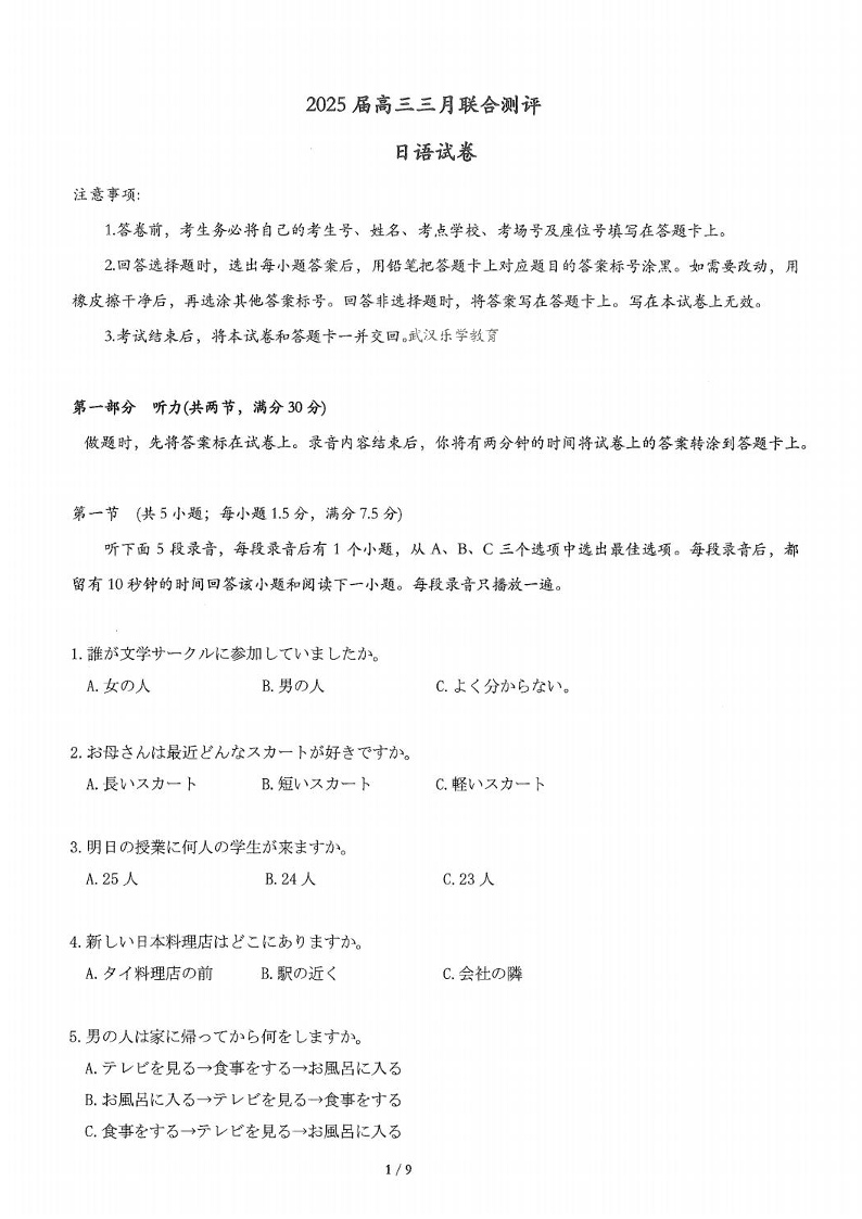 湖北省高中名校联盟2025届高三三月联合测评 日语.pdf