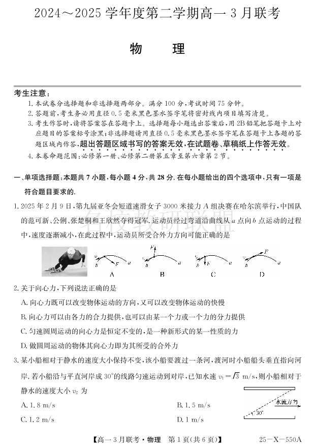 安徽省县中联盟2024-2025学年高一下学期3月联考试题 物理(含答案).pdf