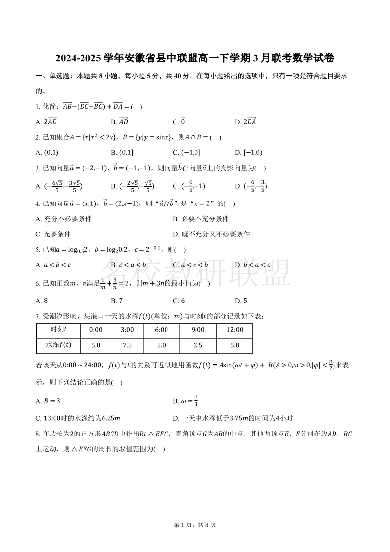 安徽省县中联盟2024-2025学年高一下学期3月联考试题 数学A卷(含答案).pdf