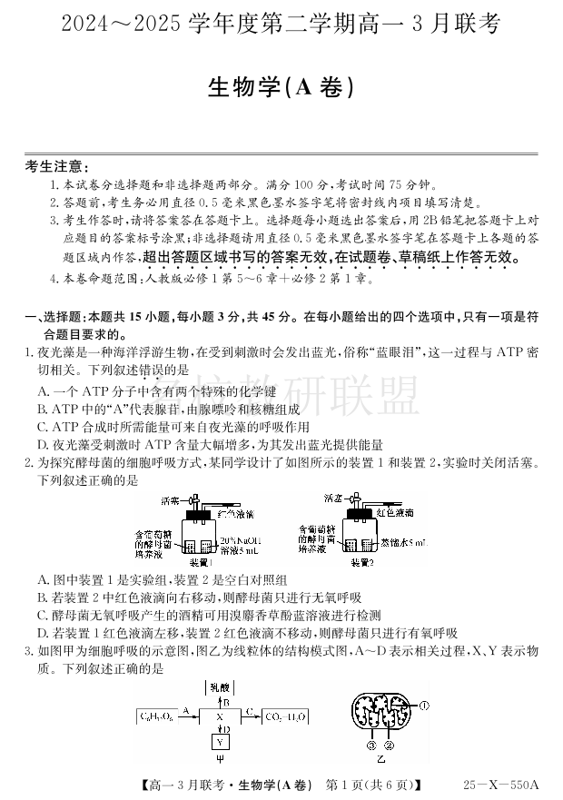 安徽省县中联盟2024-2025学年高一下学期3月联考试题 生物(含答案).pdf