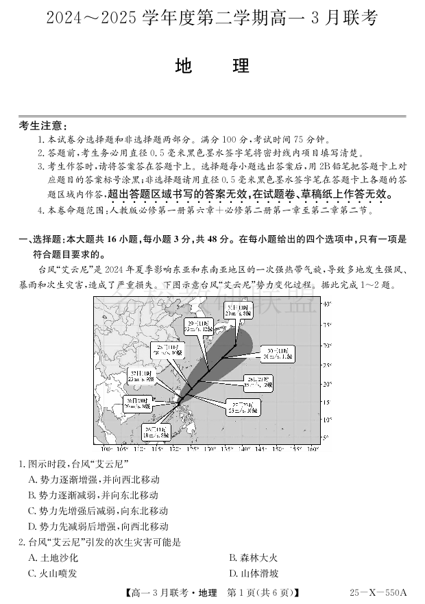 安徽省县中联盟2024-2025学年高一下学期3月联考试题 地理(含答案).pdf