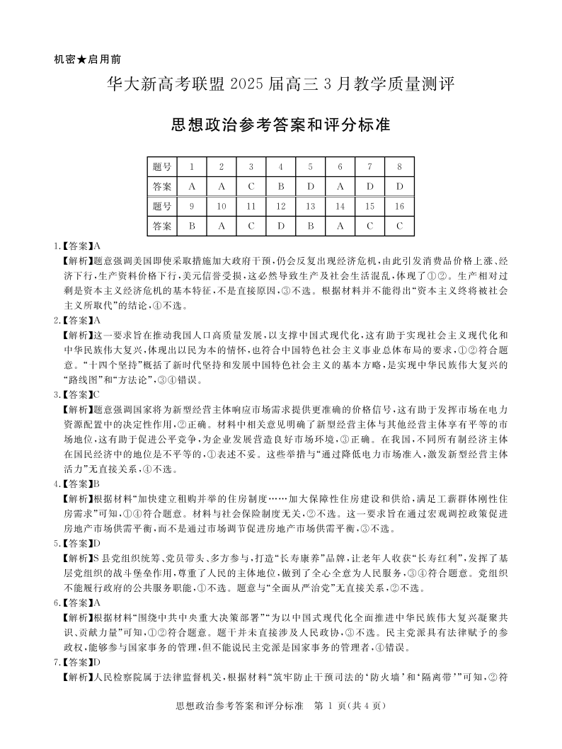 华大新高考联盟2025届高三3月教学质量测评 政治答案.pdf