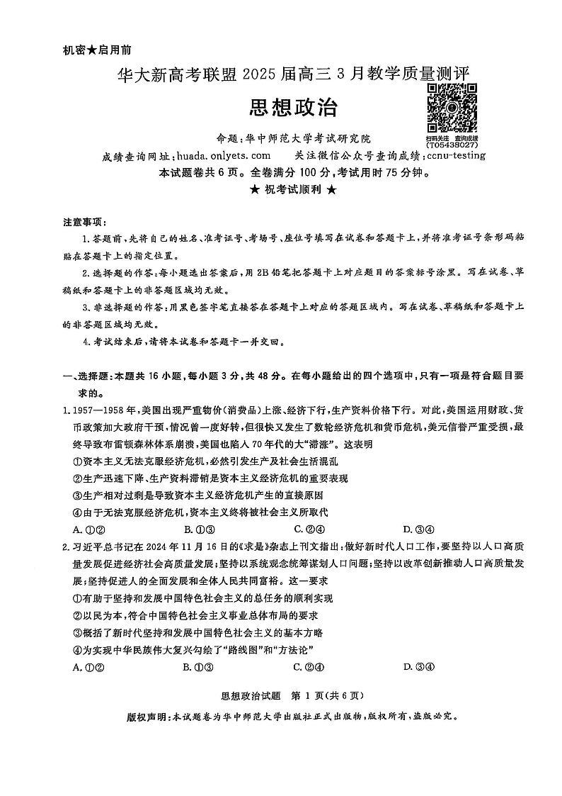华大新高考联盟2025届高三3月教学质量测评 政治.pdf
