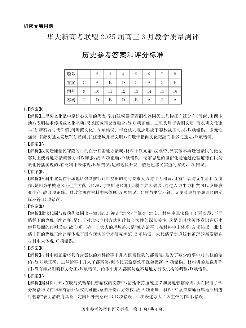 华大新高考联盟2025届高三3月教学质量测评 历史答案.pdf