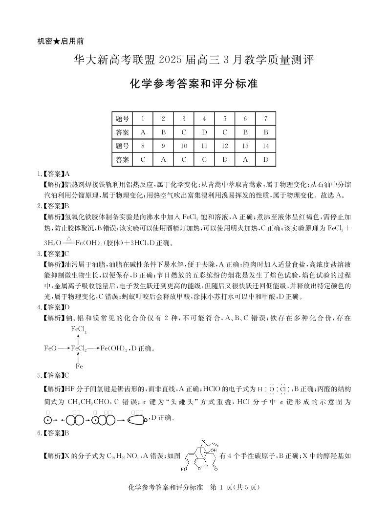 华大新高考联盟2025届高三3月教学质量测评 化学答案.pdf