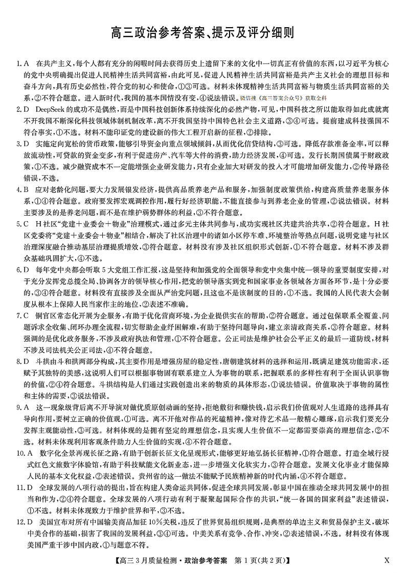 九师联盟2025届高三年级下学期3月质量检测 政治答案.pdf