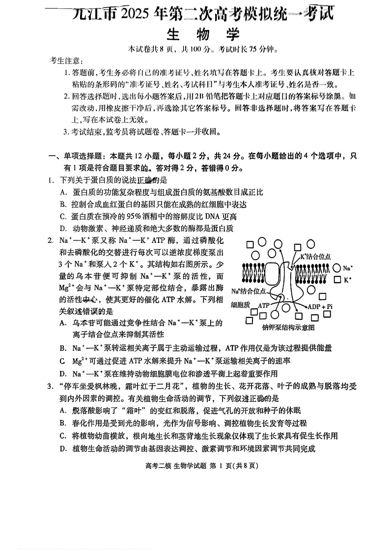 江西省九江市2025届高三第二次高考模拟统一考试 生物(含答案).pdf