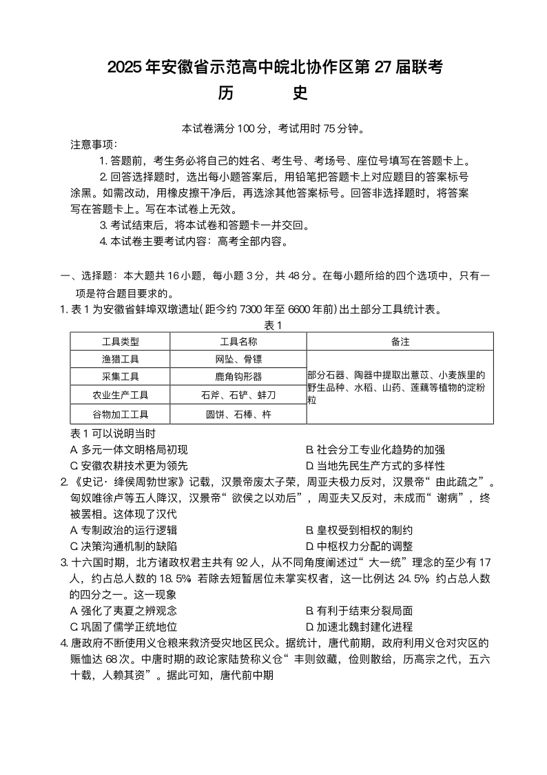 2025年安徽省示范高中皖北协作区第27届联考 历史.pdf
