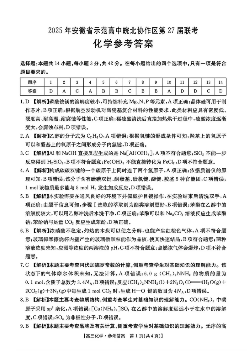 2025年安徽省示范高中皖北协作区第27届联考 化学答案.pdf