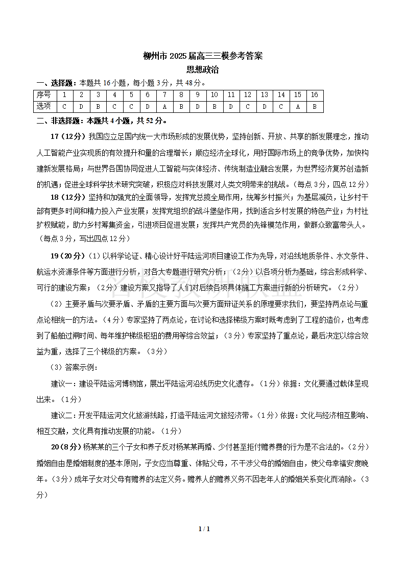 柳州2025年3月高三三模 政治答案.pdf