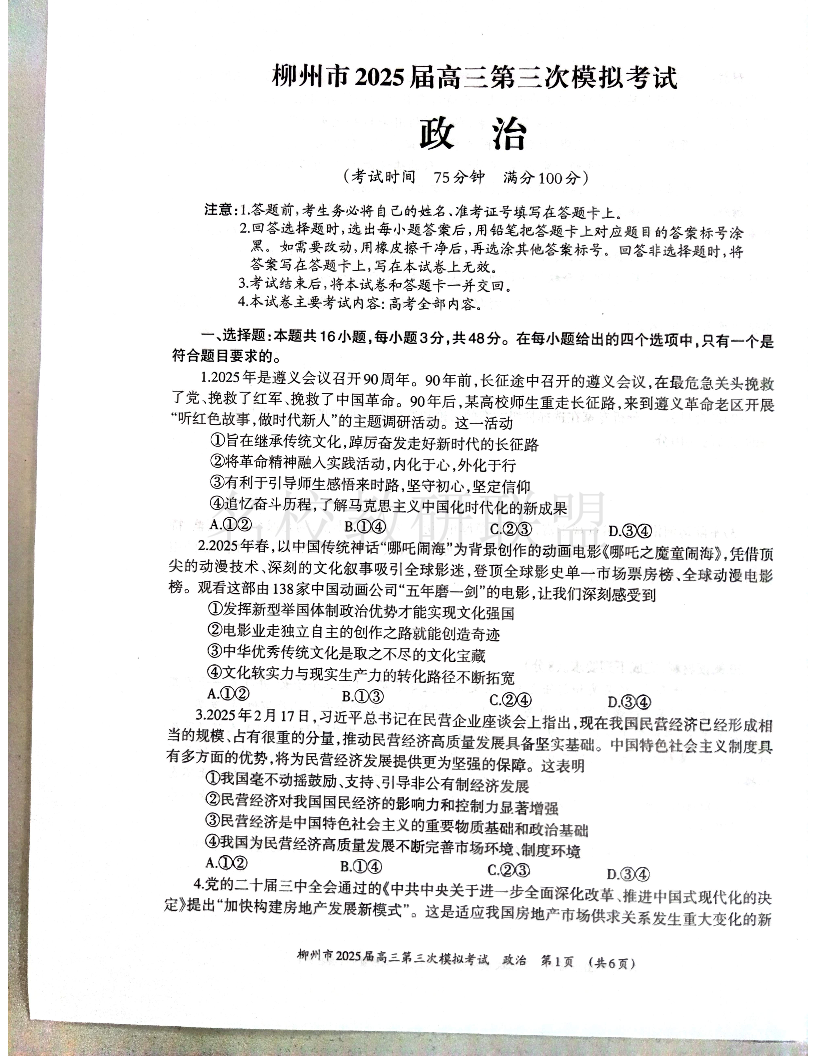 柳州2025年3月高三三模 政治.pdf