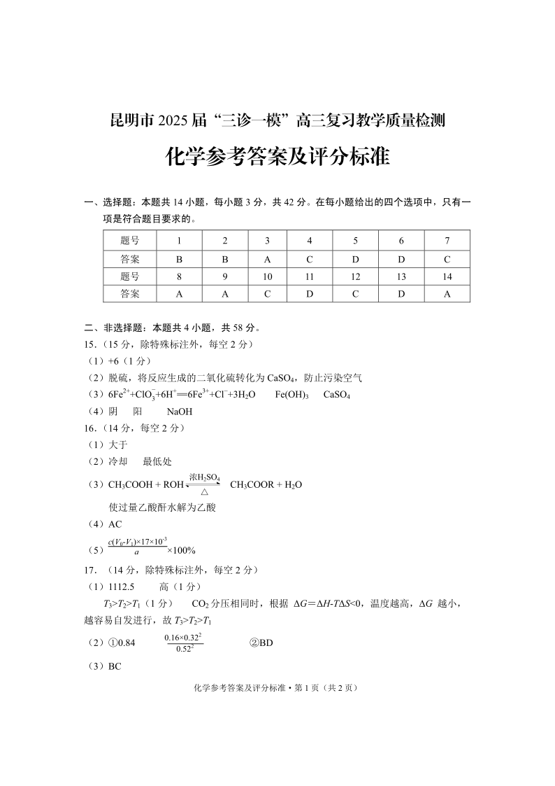 云南省昆明市2025届“三诊一模”高三复习教学质量检测 化学答案.pdf