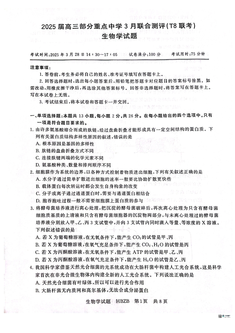 【河北版】2025届高三部分重点中学3月联合测评 生物(含答案).pdf