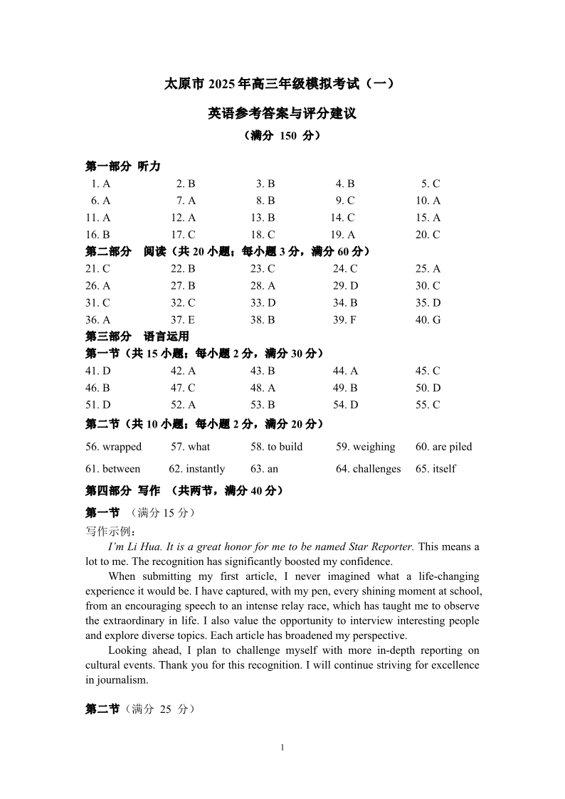 太原市2025年高三年级模拟考试(一)英语答案.pdf