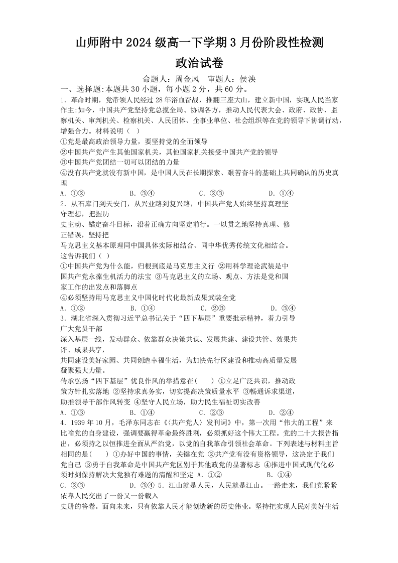 山东师范大学附属中学2024级高一下学期3月阶段性检测试题 政治(含答案).docx