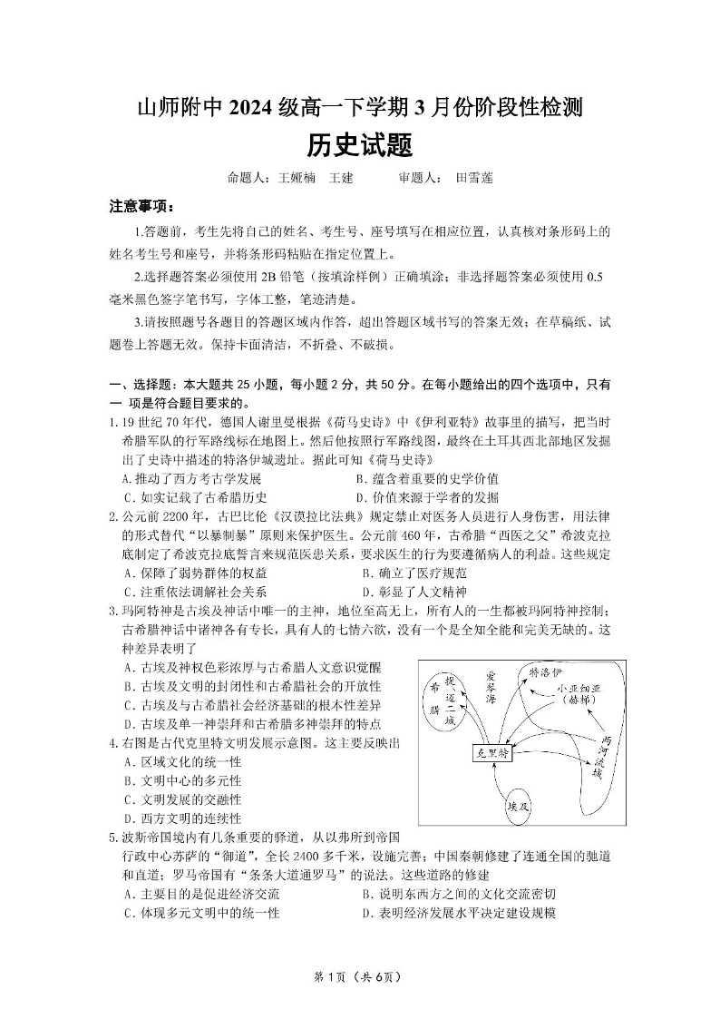 山东师范大学附属中学2024级高一下学期3月阶段性检测试题 历史(含答案).pdf