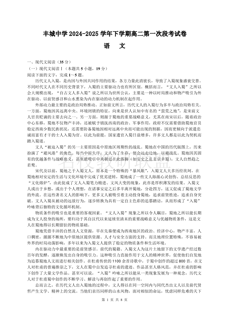 江西省丰城中学2024-2025学年高二下学期3月第一次段考试题 语文(含答案).pdf