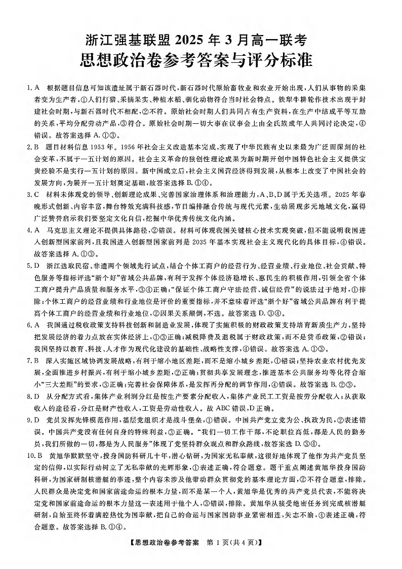 浙江省强基联盟2025年高一第二学期3月联考 政治答案.pdf