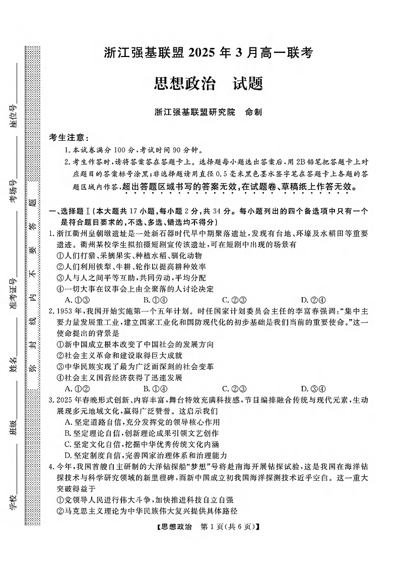 浙江省强基联盟2025年高一第二学期3月联考 政治.pdf
