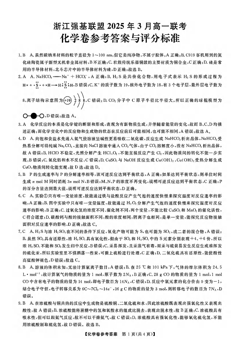 浙江省强基联盟2025年高一第二学期3月联考 化学答案.pdf