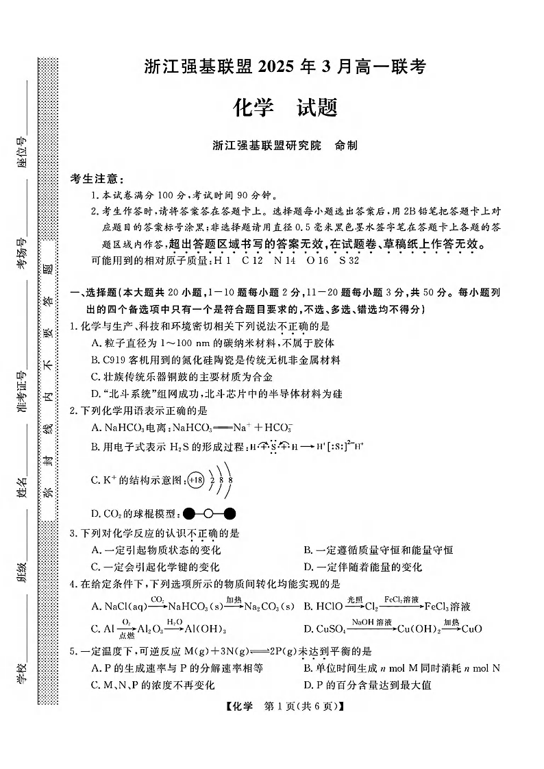 浙江省强基联盟2025年高一第二学期3月联考 化学.pdf