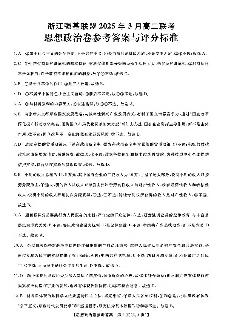 浙江省强基联盟2025年高二第二学期3月联考 政治答案.pdf