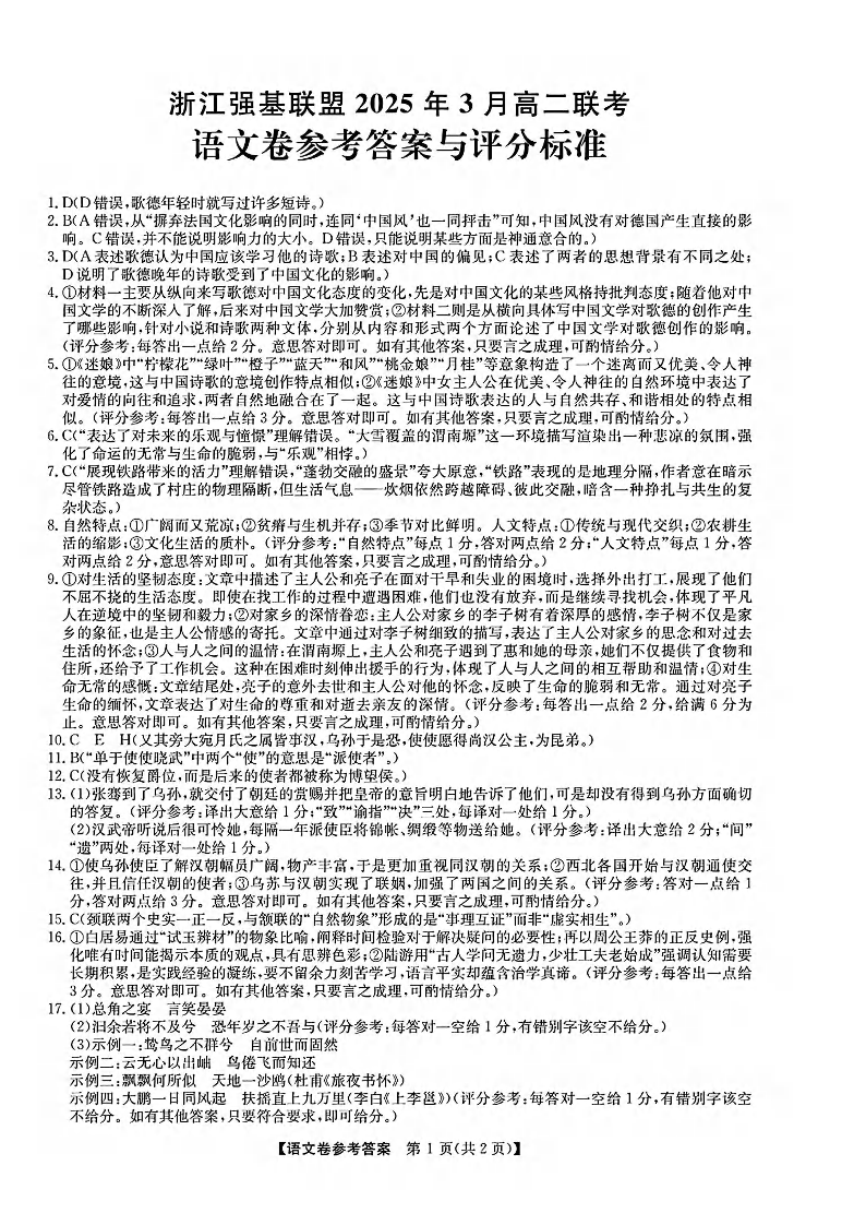 浙江省强基联盟2025年高二第二学期3月联考 语文答案.pdf