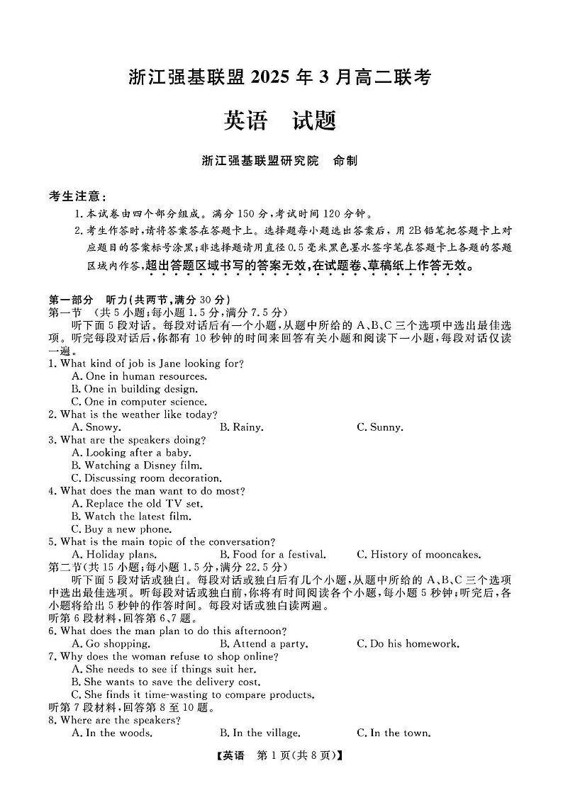 浙江省强基联盟2025年高二第二学期3月联考 英语.pdf