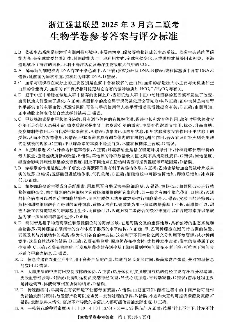 浙江省强基联盟2025年高二第二学期3月联考 生物答案.pdf