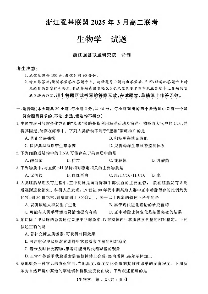 浙江省强基联盟2025年高二第二学期3月联考 生物.pdf