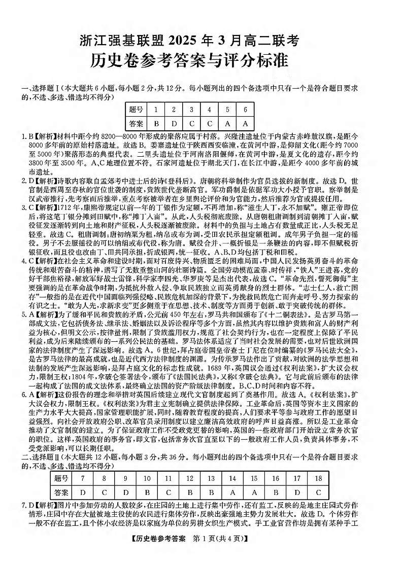 浙江省强基联盟2025年高二第二学期3月联考 历史答案.pdf
