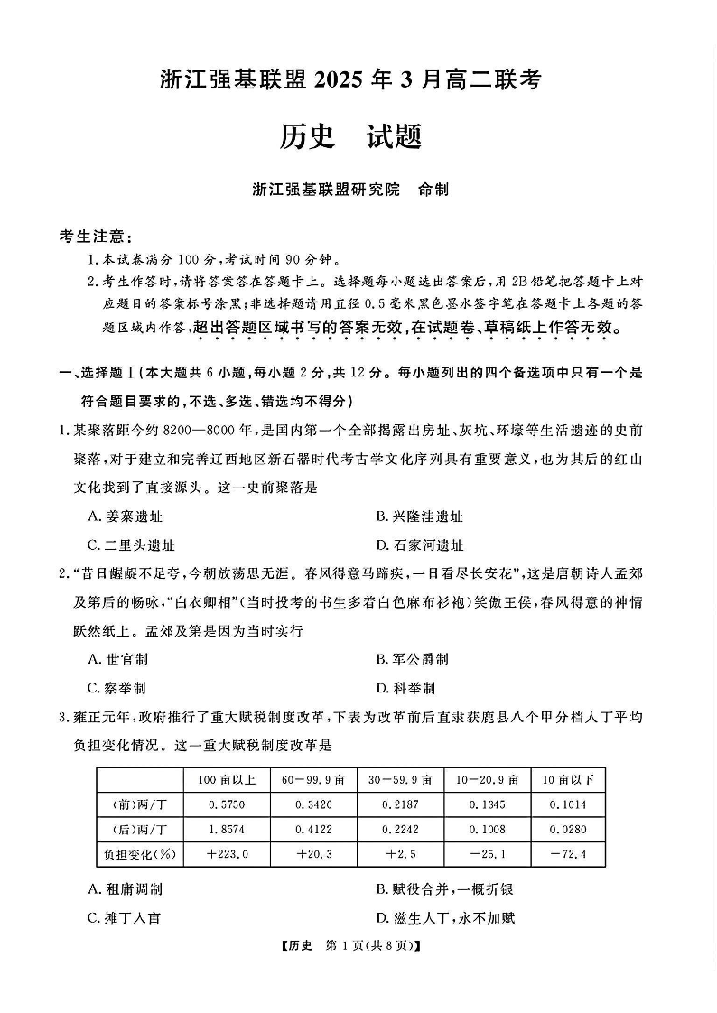 浙江省强基联盟2025年高二第二学期3月联考 历史.pdf