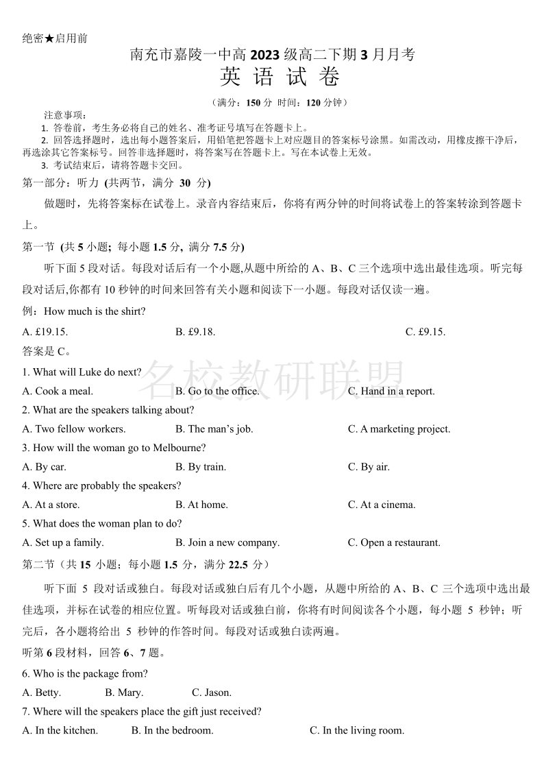 嘉陵一中2023级高二下期第一次月考 英语.pdf