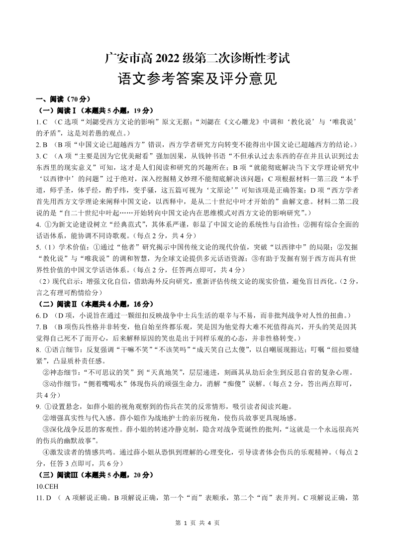 四川省广安市高2022级第二次诊断性考试 语文答案.pdf