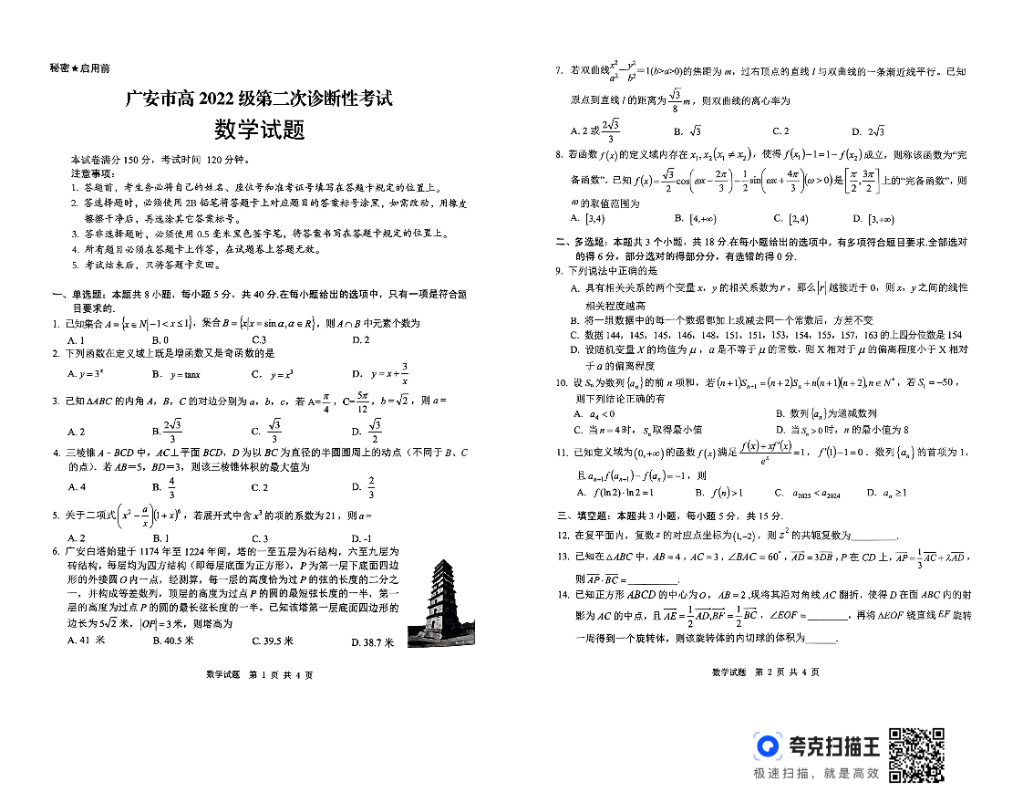 四川省广安市高2022级第二次诊断性考试 数学.pdf