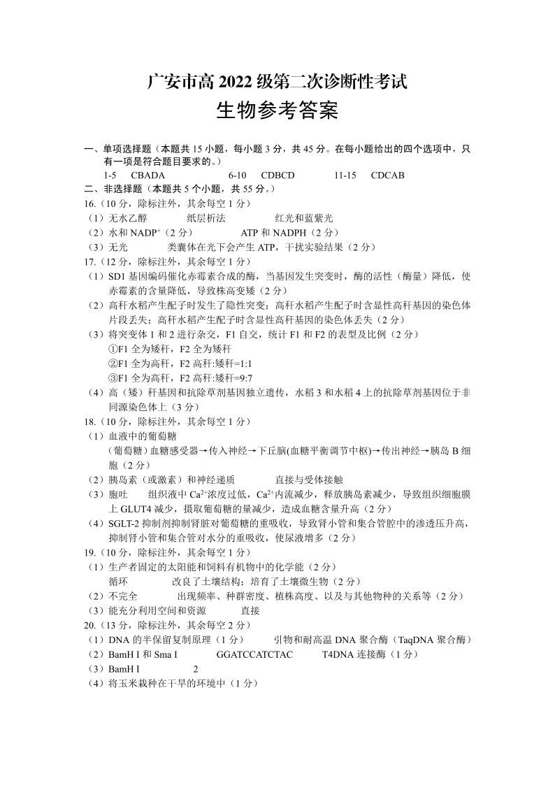 四川省广安市高2022级第二次诊断性考试 生物答案.pdf