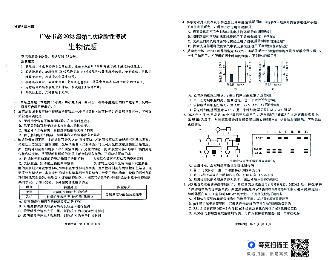 四川省广安市高2022级第二次诊断性考试 生物.pdf