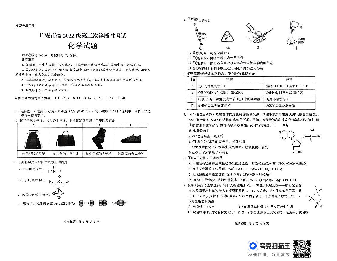 四川省广安市高2022级第二次诊断性考试 化学.pdf