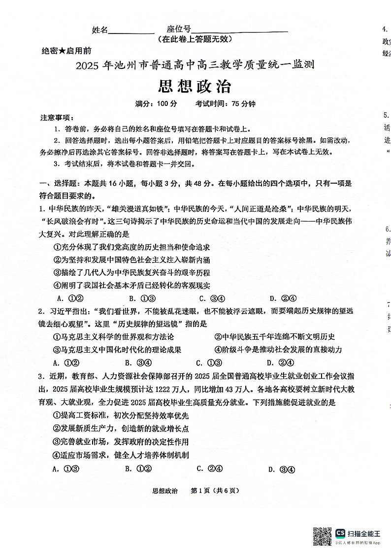 2025年池州市普通高中高三教学质量统一监测 政治.pdf
